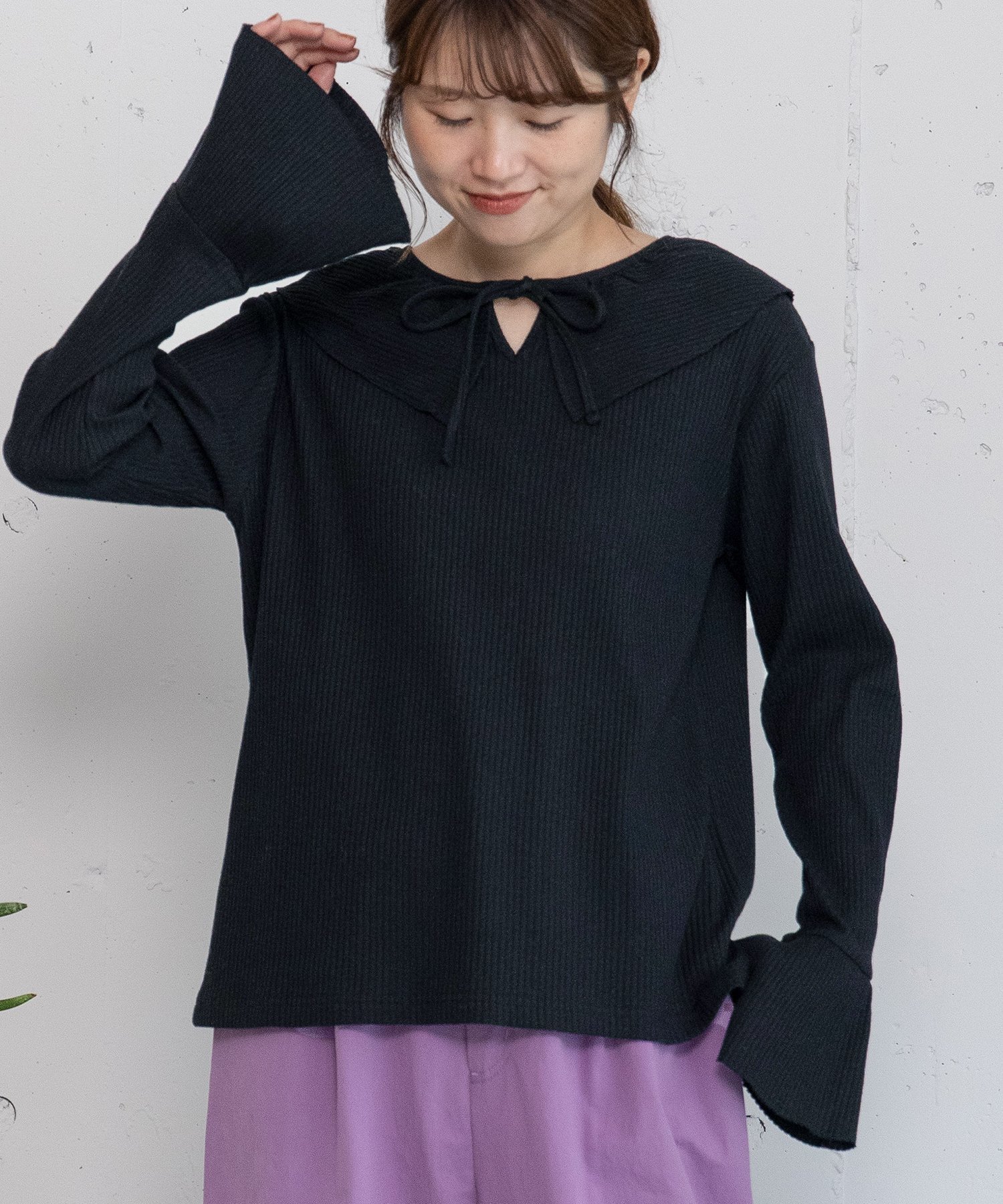■Point衿元のラッフルカラーと袖口のギャザー切り替えが華やかな雰囲気のトップス。