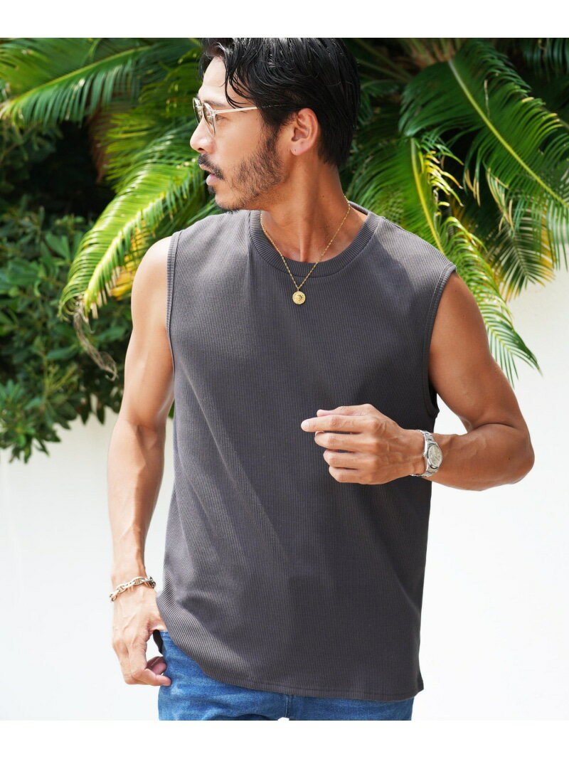 プチプライスからスタートできるタンクトップメンズトップスノースリーブ袖なしストレッチ伸縮リブ編みテレコ素材インナーの決定版!180cm66kg着用サイズ:L型番:218438-100-103 PW9191