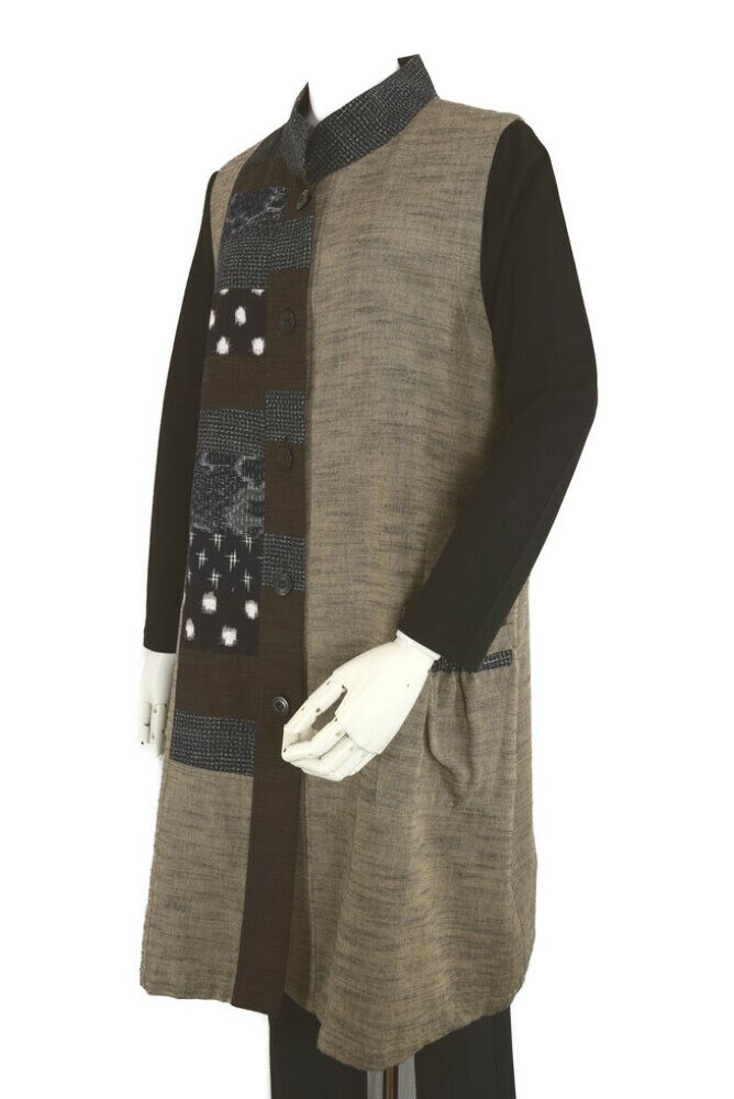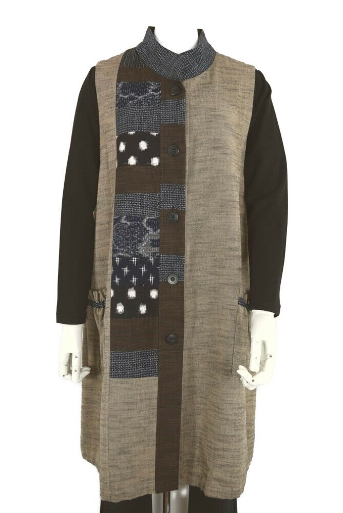 【Ⅿ〜Ⅼ】フリーサイズ 身 幅:53cm 着 丈:90cm ●絣パッチワークと前ボタンを取り入れクラシック調の感性がお気に入りのロングベストです。