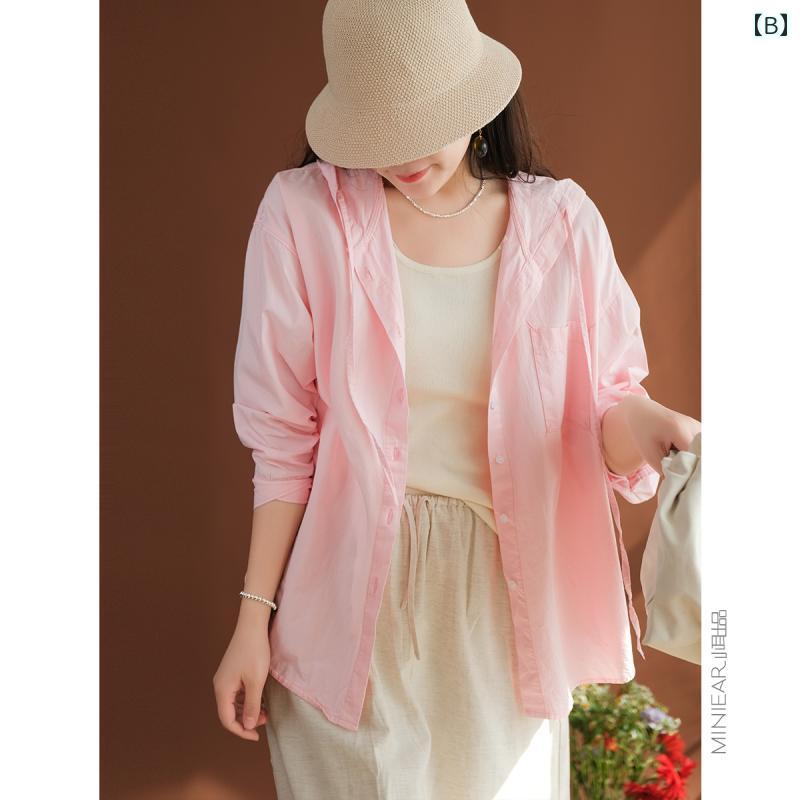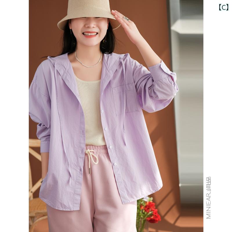 Xiaoer プロデュース [ 春夏の お供 ] 快適で 肌に 優しい 綿の フード 付き シャツ. 女性用のゆったりと した 無地の 長袖 シャツ: Xiaoerがプロデュースサイズ: フリーサイズ襟のタイプ: フード付き服の前立て: 1列マルチボタン色の分類: ホワイトチェリーパウダー.バニラ.パープル.シーブルー.バドグリーン商品番号:C1391袖丈:長袖服の詳細: ポケット素材構成: コットン100