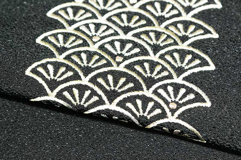 ポリエステルのポップな刺繍半衿です。黒地の縮緬地に花青海波の柄を刺繍した遊び心のあるオシャレな半衿です。衿元のアクセントとして小紋や紬などの普段着の長襦袢にオシャレです。 品質 生地 ポリエステル 100% 刺繍糸 レーヨン 100% 日本製 お手入れ ドライクリーニング襟元のおしゃれは刺繍半襟で!