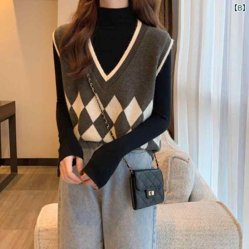 ・スタイル: 拼接・ネックライン: Vネック・柄: 格子柄・素材: ニット, ポリエステル・カラー: ブラック, グレー, コーヒー・サイズ: フリーサイズ・対象: 成人, 女性・フィット: スリム・種類: ベスト・フロント: プルオーバー・テイスト: アーバン, エレガント・主素材含有量: 30%-50%
