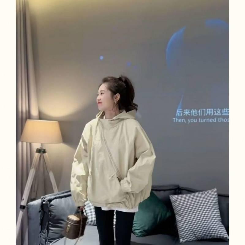 ・主な素材: 涤纶(聚酯纤维)・主面料成分: 涤纶(聚酯纤维)95%以上・袖丈: 長袖・袖型: 落肩袖・领型: 连帽・颜色: 黒色, 浅杏色, 白色・尺码: S, M, L, XL, 2XL・风格: 都市风・适用年龄段: 成人・适用性别: 女・产品类别: 外套