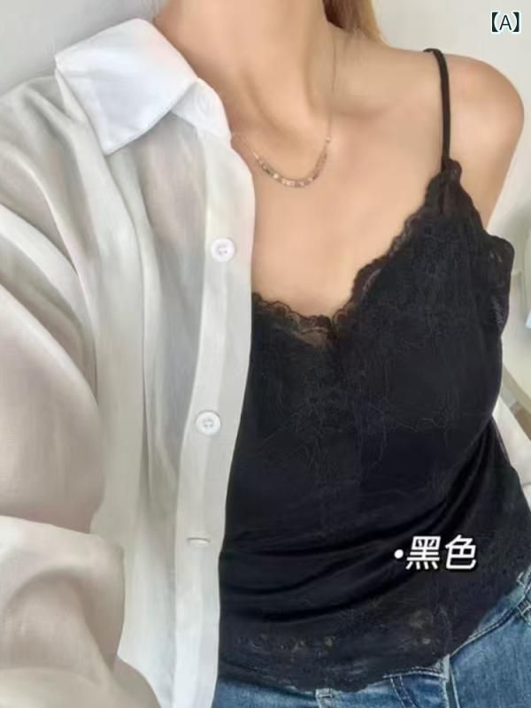 ・カテゴリ: 吊带背心・素材: 锦纶、蕾丝・カラー: ブラック、ホワイト、紫色、驼色・サイズ: 均码80-130・スタイル: 法式・ネックライン: Vネック・詳細: 蕾丝花边・厚さ: 薄 (101-120g/平米)・主な素材の含有量: 70%-80%