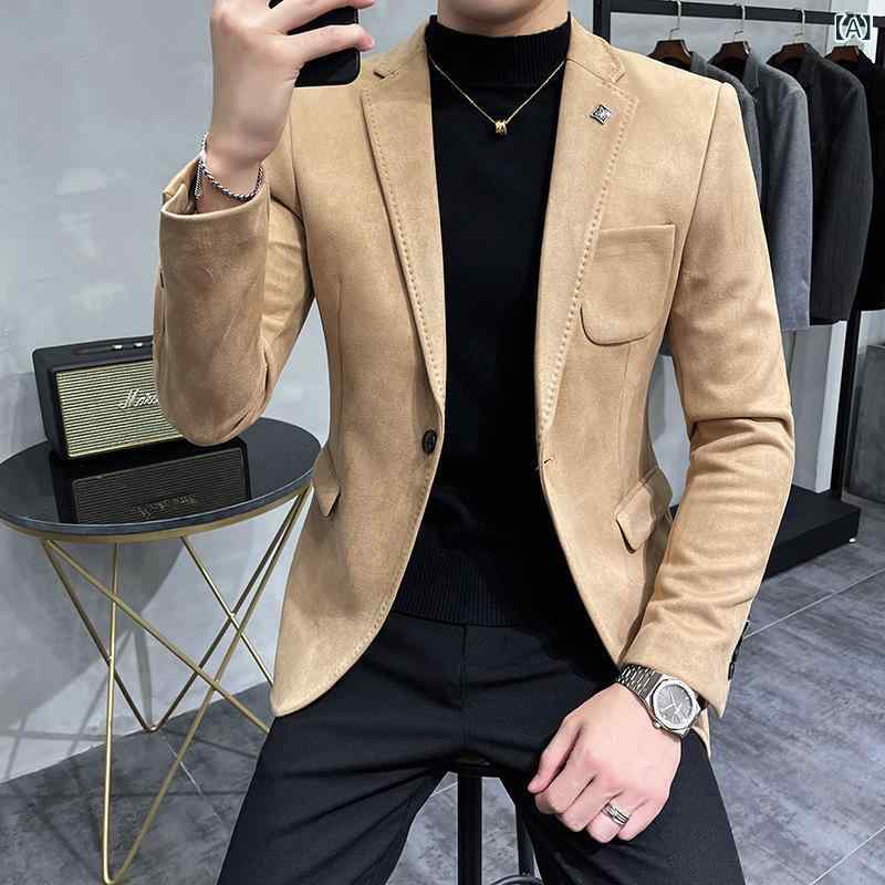 ・版型: 修身型・領型: スーツ・前立て: シングルブレスト、ボタン1つ・スタイル: 韓国・柄: 無地・誤差範囲: 1~2cm・素材: 化学繊維混紡・主な素材: ポリエステル69%・裏地: アクリル・対象: 若者・加工: 洗濯機洗い、アイロン不要・袖丈: 長袖・着丈: レギュラー・ポケット: フラップポケット・色: カーキ、イエロー、グレー、グリーン、ブラック、ロイヤルブルー・サイズ: M、L、XL、2XL、3XL、4XL・裾: ストレート・対象年齢: 大人・対象性別: 男性・カテゴリ: カジュアルスーツ