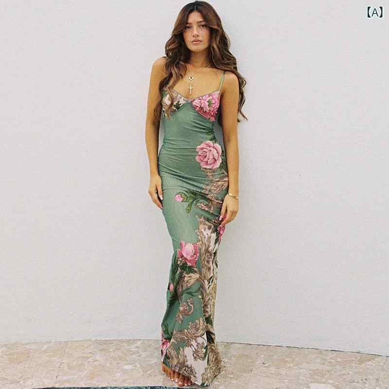 ・图案: 植物花卉・工艺: 数码印花・款式: 吊带款・组合形式: 单件・裙长: 长裙・裙型: 包臀裙・领型: V字领・袖型: 无袖・袖长: 无袖・腰型: 中腰・流行元素: 花边吊带・主面料成分: 涤纶(聚酯纤维)・主面料成分2: 氨纶・颜色: 绿色,白色,紫色,粉色,浅藍色・尺码: S,M,L・风格类型: 街头潮人・门襟: 套头・主面料成分含量: 90%(含)-95%(不含)・风格: 欧美风・裙类别: 连衣裙・跨境风格类型: 个性街头・是否跨境货源: 是・主面料成分2含量: 30%以下