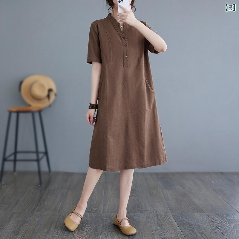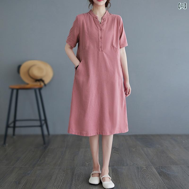 ・图案: 纯色・工艺: 口袋+纽扣・款式: 套头・组合形式: 单件・裙长: 中长裙・裙型: A字裙・领型: V领・袖型: 常规袖・袖长: 短袖・腰型: 宽松腰・流行元素: 口袋+纽扣・主面料成分: 棉・主面料成分2: 麻・颜色: 粉色, 咖色, 藏青・尺码: M, L, XL, 2XL・风格类型: 文艺复古・门襟: 单排扣・主面料成分含量: 50%-70%・风格: 文艺风・裙类别: 连衣裙・跨境风格类型: 舒适休闲・主面料成分2含量: 30%-50%