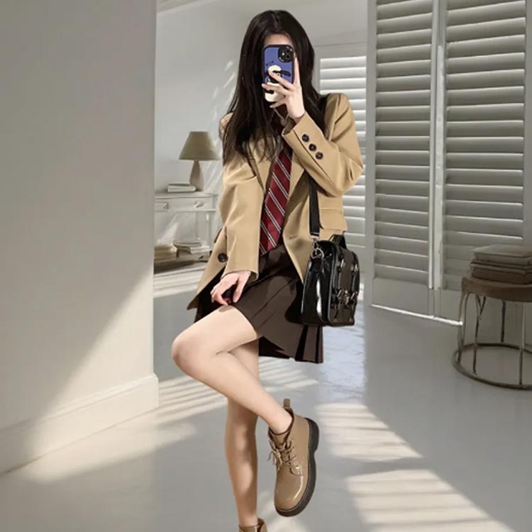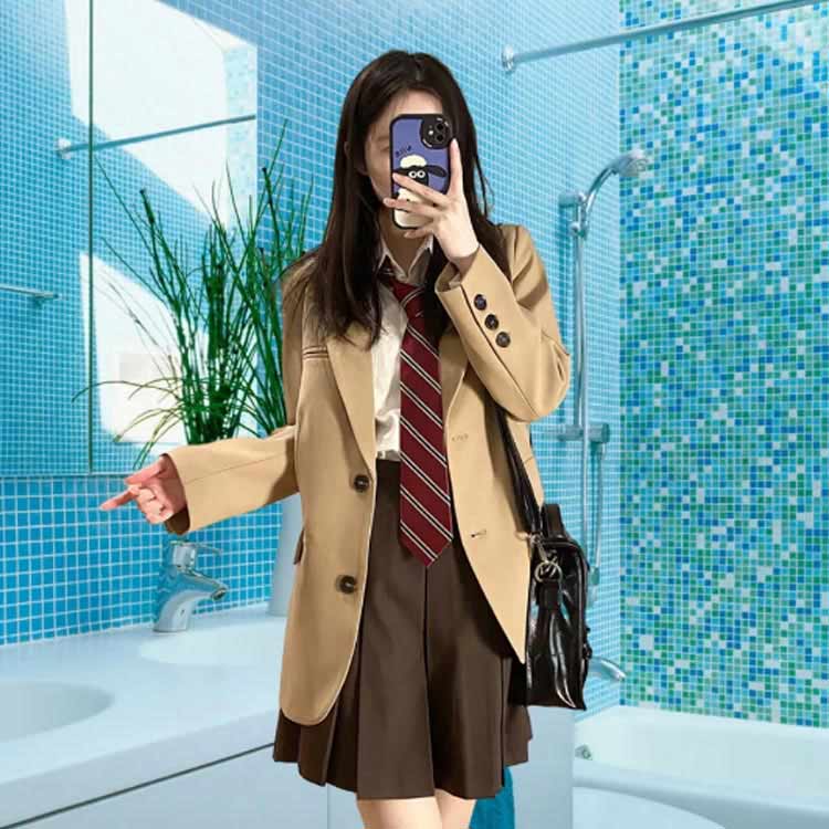 ルーズフィットでシルエットがより綺麗にみえるスクールブレザー!薄手軽量のさわり心地、着心地もよく、ポリエステル素材で気候が変わりやすい春や秋など肌寒い季節にも最適なジャケットです。