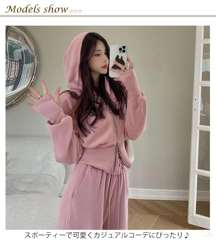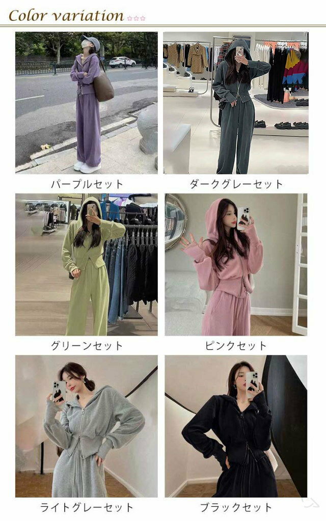 スポーティーで可愛くカジュアルコーデにぴったり♪外出先でもおうちでも活躍するリラックスしたい時に(^-^)パーカーは前開きのジッパーで着脱簡単!パンツのウエスト部分はゴムになっているので快適です♪ サイズ M L XL 2XL サイズについての説明 表記の通り 素材 ポリエステル 色 パープルセット ダークグレーセット グリーンセット ピンクセット ライトグレーセット ブラックセット 備考 ●サイズ詳細等の測り方はスタッフ間で統一、徹底はしておりますが、実寸は商品によって若干の誤差(1cm〜3cm )がある場合がございますので、予めご了承ください。