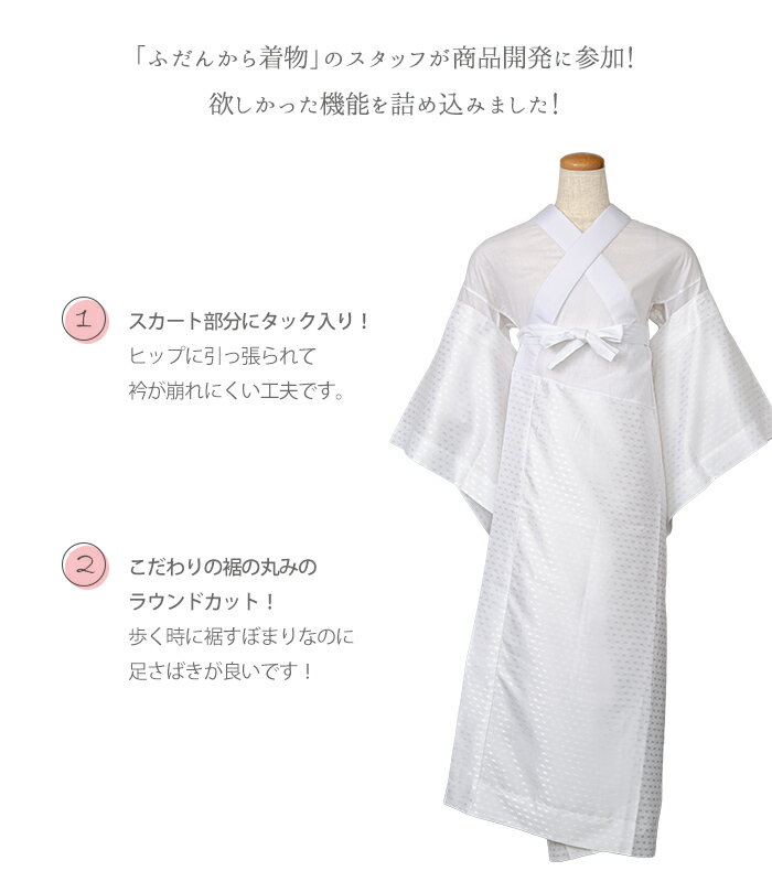 「ひみつの半襦袢」の特徴に加え、 1.スカート部分にタック入り! ヒップに引っ張られて衿が崩れにくい工夫です。