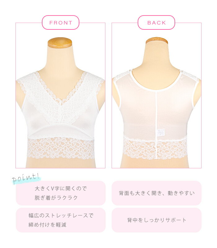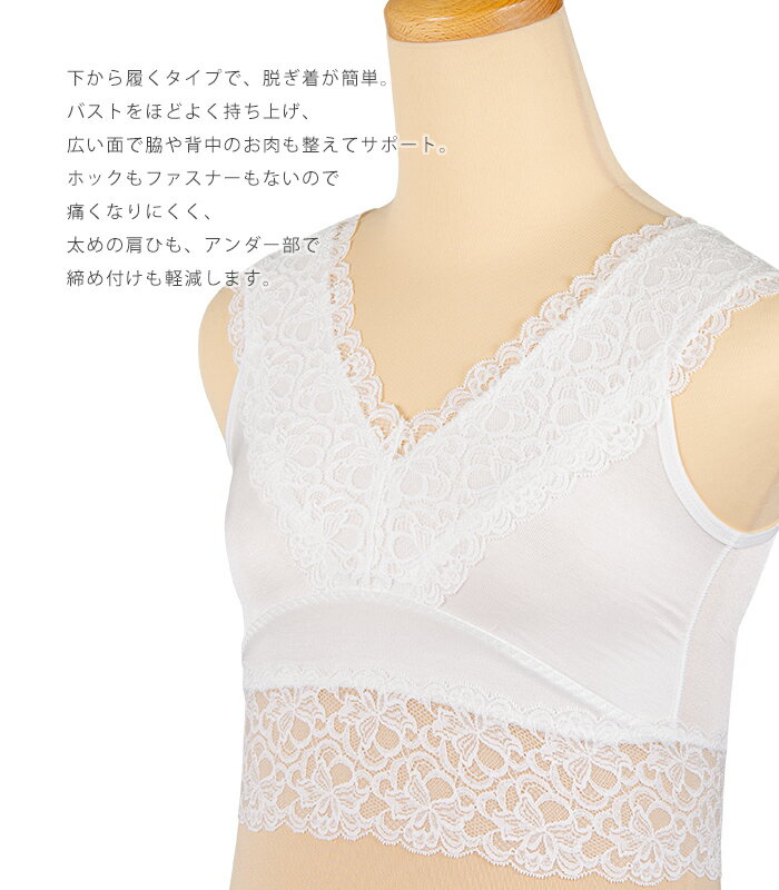 ホックもファスナーもないので痛くなりにくく、太めの肩紐とアンダー部の幅広のストレッチレースで締め付けも軽減します。