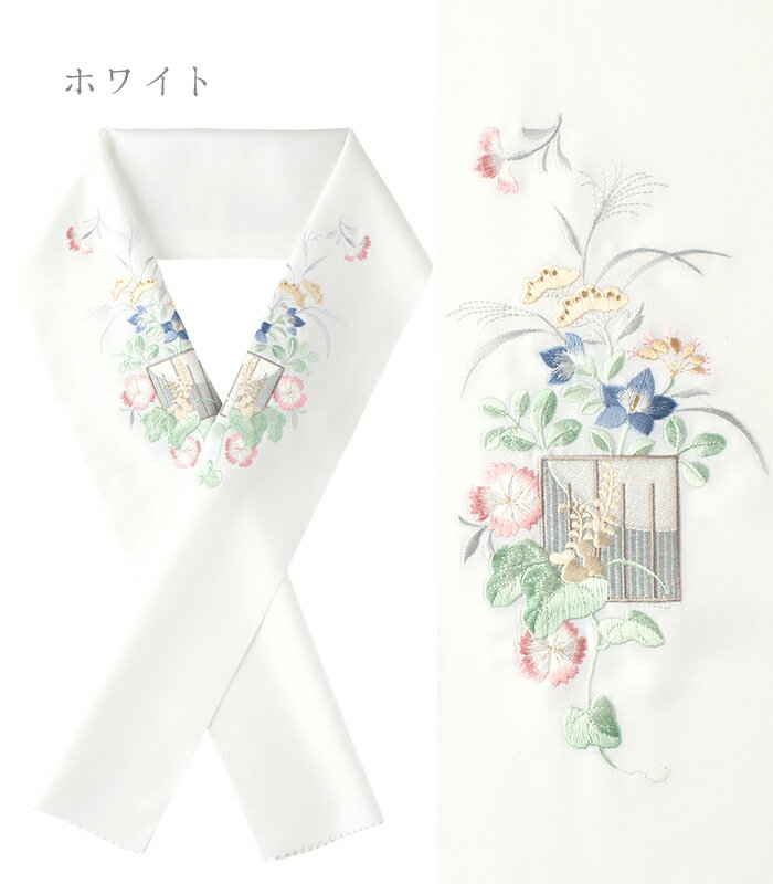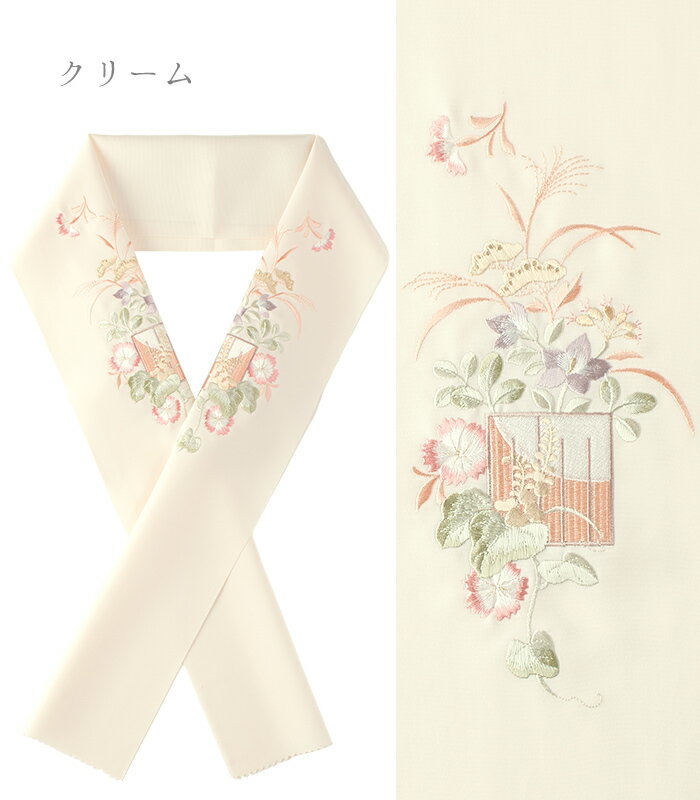 源氏香に月、秋草のたっぷりとした刺繍がお顔まわりに華やぎを与えます。 【品質】 生地:ポリエステル100% 刺繍糸:レーヨン100% 日本製 【サイズ】 幅約16.5×長さ約115cm 【お手入れ】 ドライクリーニング この製品は加工の性質上、汗や水分・強い摩擦などにより色落ちが生じる場合があります。