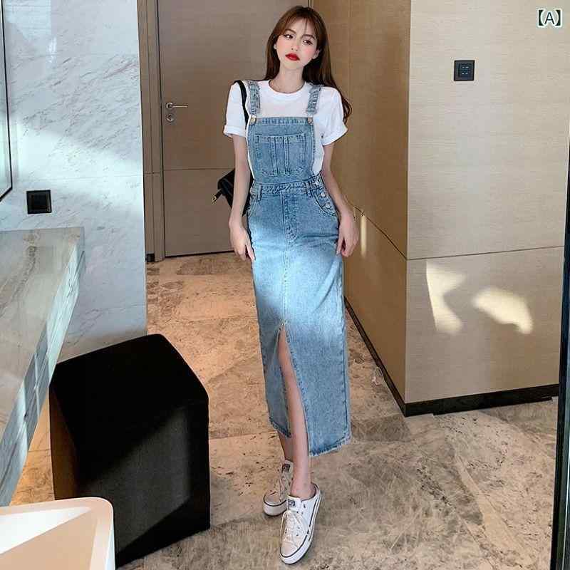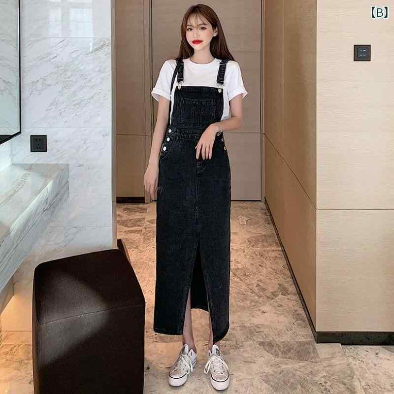 ・素材: デニム、綿・柄: 切り替え・スタイル: ストリート・袖丈: ノースリーブ・スカート丈: ミモレ丈・スカートタイプ: フレア・カラー: ライトブルー、ブラック、ホワイト・サイズ: S、M、L、XL・ウエスト: ミディアムウエスト