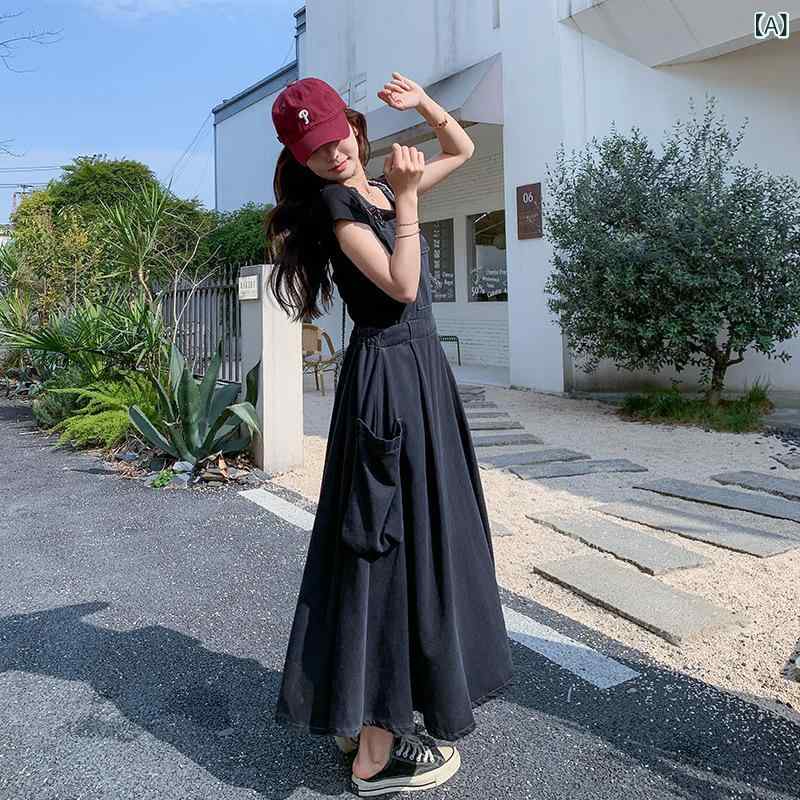 ・素材: デニム・柄: 無地・製法: パッチワーク・スタイル: サロペット・組み合わせ: ワンピース・スカート丈: ロング・スカートタイプ: Aライン・ネックライン: スクエアネック・袖丈: 半袖・ウエスト: ミドルウエスト・要素: 切り替え・カラー: ブラック・サイズ: S、M、L、XL・系統: 通勤・フロント: プルオーバー・主素材: テンセル 70-80%・種類: ワンピース・雰囲気: エレガント