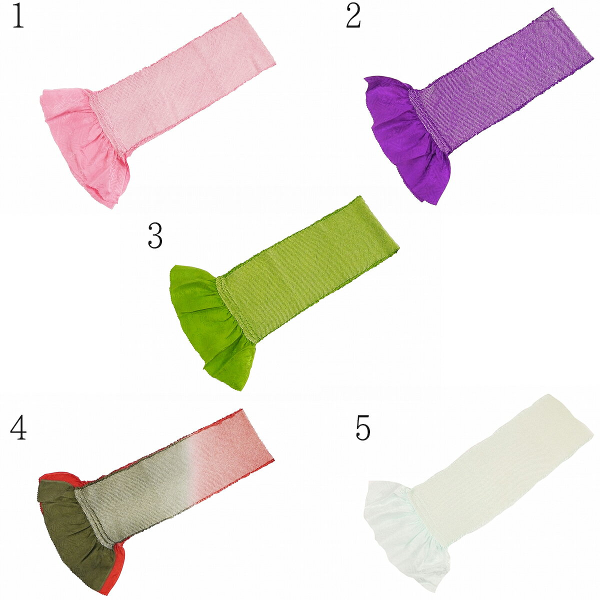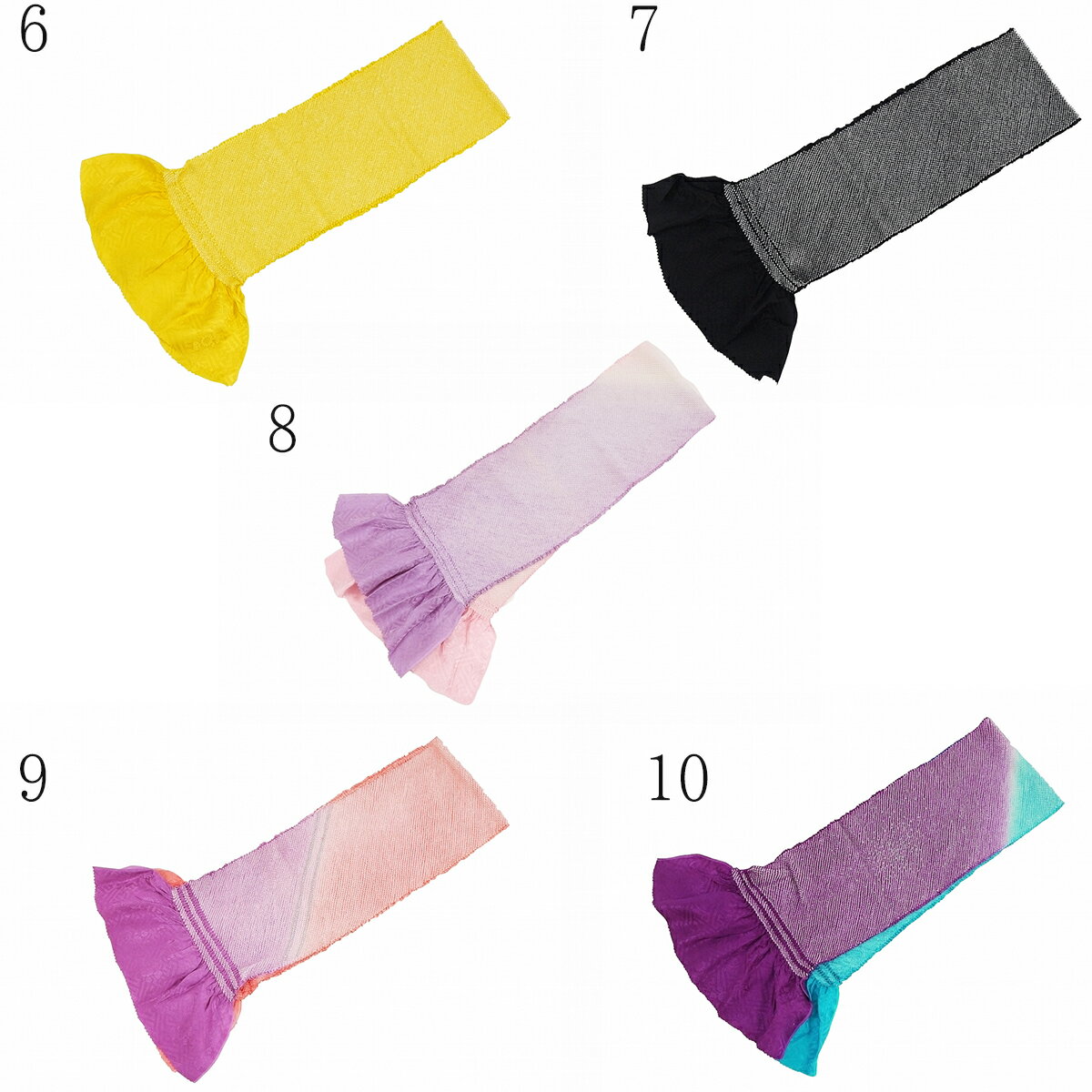 サイズ 巾約17cm × 約120cm 色 1:ピンク 2:紫 3:黄緑 4:うぐいす×赤 5:ミントグリーン 6:黄 7:黒 8:薄紫×ピンク 9:ピンク×紫 10:青×紫 素材 絹 100% 正絹帯揚げ 一覧はこちら