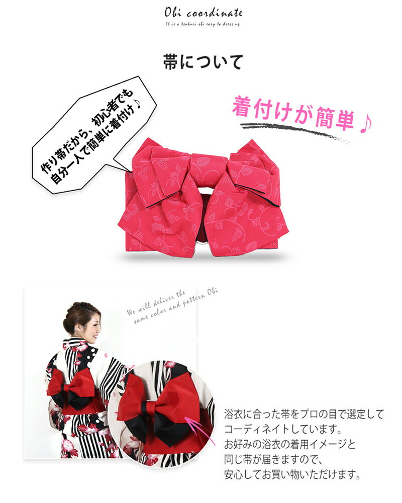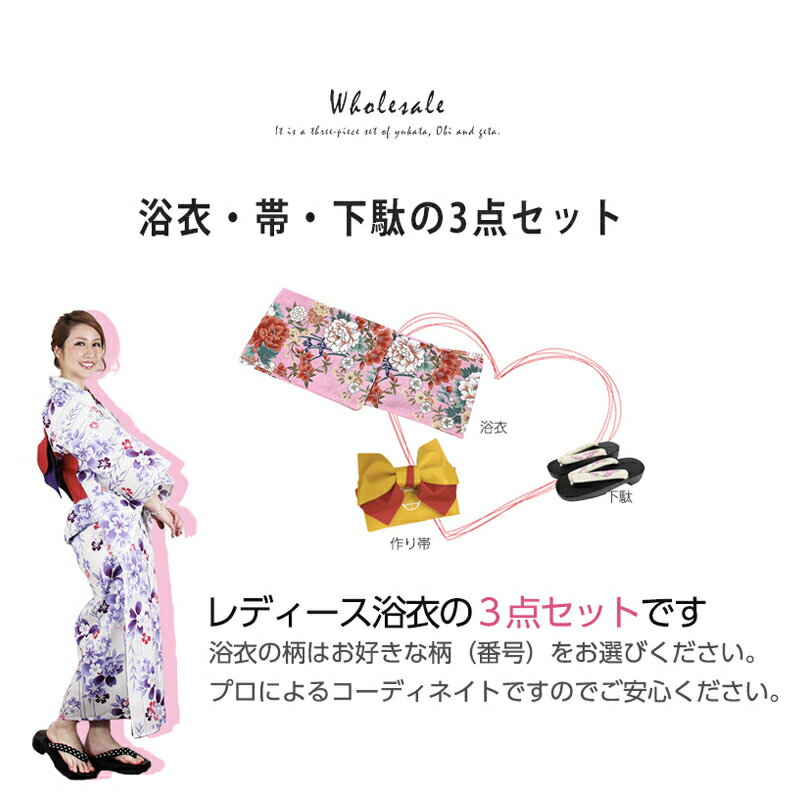 【女物浴衣 3点セット】 浴衣、帯、下駄の3点セット♪ プロによるコーディネートで見た目は安心! 帯は簡単に着付けができる作り帯になっています。