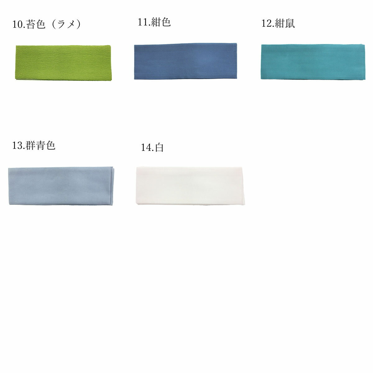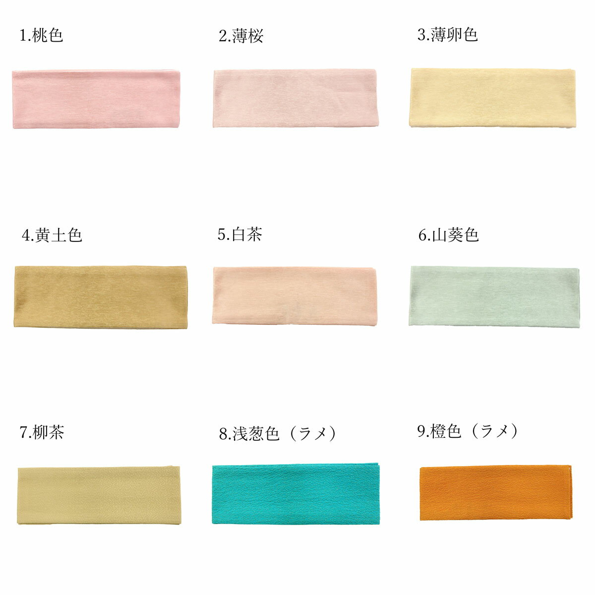 サイズ 幅:約11~12cm 長さ:約126~133cm 色 1.桃色 2.薄桜 3.薄卵色 4.黄土色 5.白茶 6.山葵色 7.柳茶 8.浅葱色(ラメ) 9.橙色(ラメ) 10.苔色(ラメ) 11.紺色 12.紺鼠 13.群青色 14.白 素材 表地:絹100% 裏地:ポリエステル100% 芯地:綿100% 金属糸.合金を使用している場合もあります 注意事項 できるだけ商品と同じ色目を出すよう努力しておりますが、表示画面等の違いから現物と色の違いが生じる場合がございます。