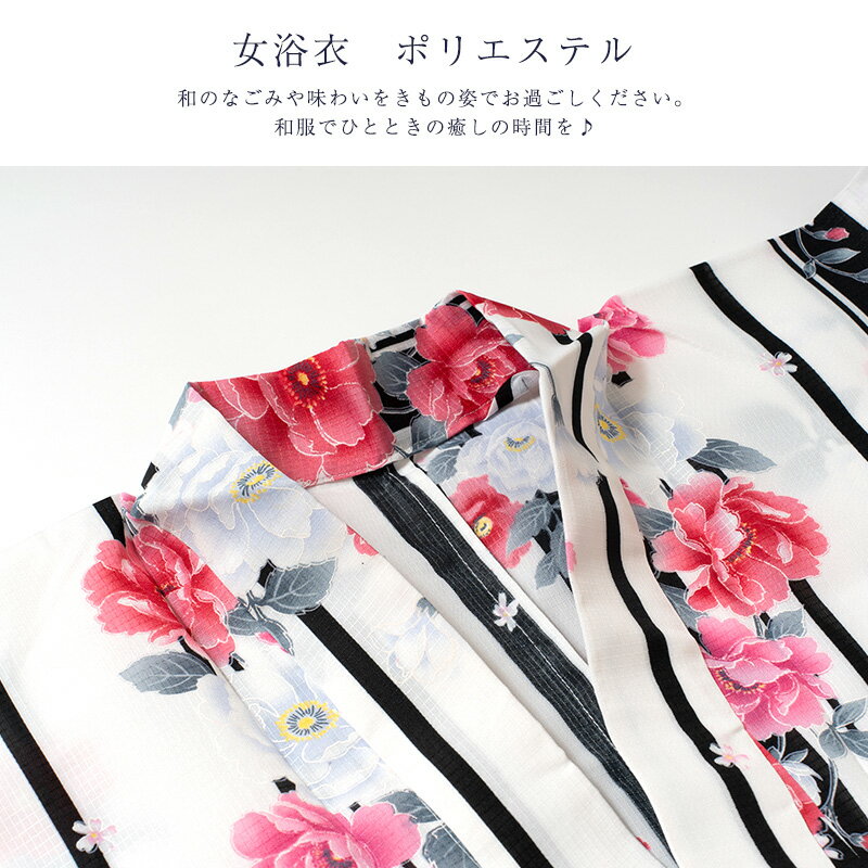 和服でひとときの癒しの時間を♪ サイズ 適応身長:152〜167cm 身丈:約163cm 袖丈:約49cm 裄丈:約67cm 色 白×黒×ピンク(牡丹) 素材 ポリエステル100% 注意事項 できるだけ商品と同じ色目を出すよう努力しておりますが、表示画面等の違いから現物と色の違いが生じる場合がございます。