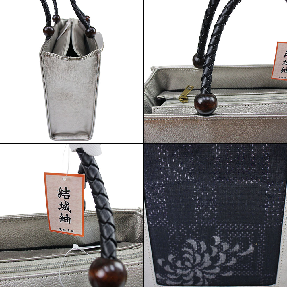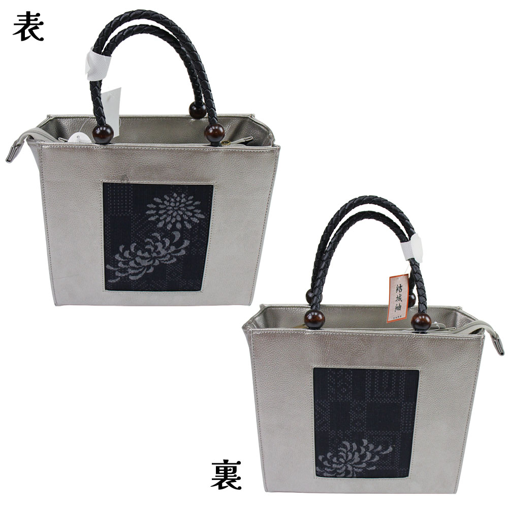 サイズ [バッグ] タテ:約25cm ヨコ:約27cm マチ:約10cm [草履] 長さ:約24.5cm 幅:約8cm 高さ:約4.5cm 色 [バッグ] 銀×紺 [草履] 濃い紫×紺 素材 [バッグ] 表地/柄:シルク、無地:PVC 裏地/ポリエステル 持ち手・底/PVC [草履] 鼻緒/シルク 台/PVC 注意事項 できるだけ商品と同じ色目を出すよう努力しておりますが、表示画面等の違いから現物と色の違いが生じる場合がございます。
