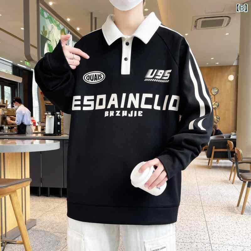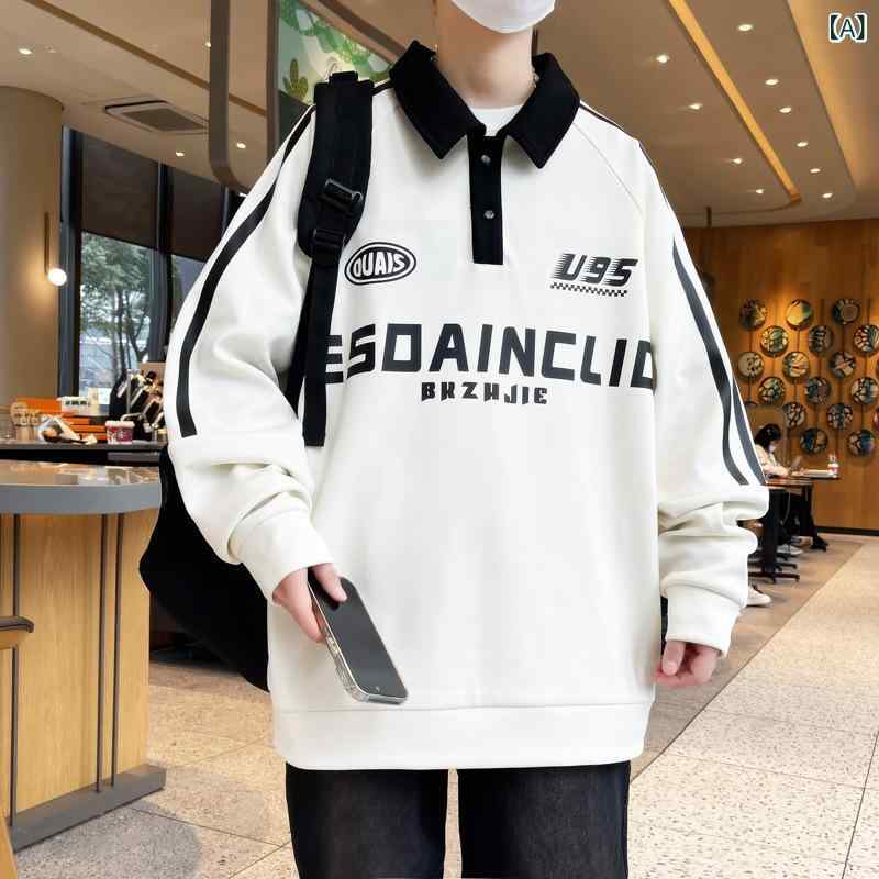 ポロシャツ メンズ 長袖 春秋 トップス アメリカン カジュアル プルオーバー スウェット トレーナー カットソー 10代 20代・スタイル: 韩版・款式: 套头・内胆: 无・领型: 翻领・袖丈: 長袖・连帽: 不连帽・厚さ: 普通・主な生地の組成: 聚酯纤维氨纶・生地名: 聚酯纤维・シーン: カジュアル・柄: 纯色・デザイン詳細: 印花・タイプ: 宽松型・色: 白色, 黒色・サイズ: M, L, XL, XXL, 3XL, 4XL・対象者: 青年・重さ: 約180g-250g・対象年齢: 成人・性別: 男・製品カテゴリ: 卫衣/绒衫