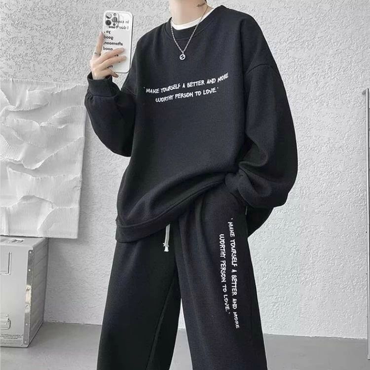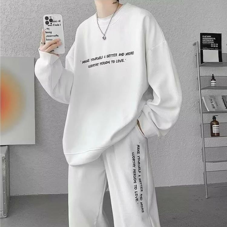 シンプルな無地のスウェットトレーナーとスウェットパンツのセットアップ。