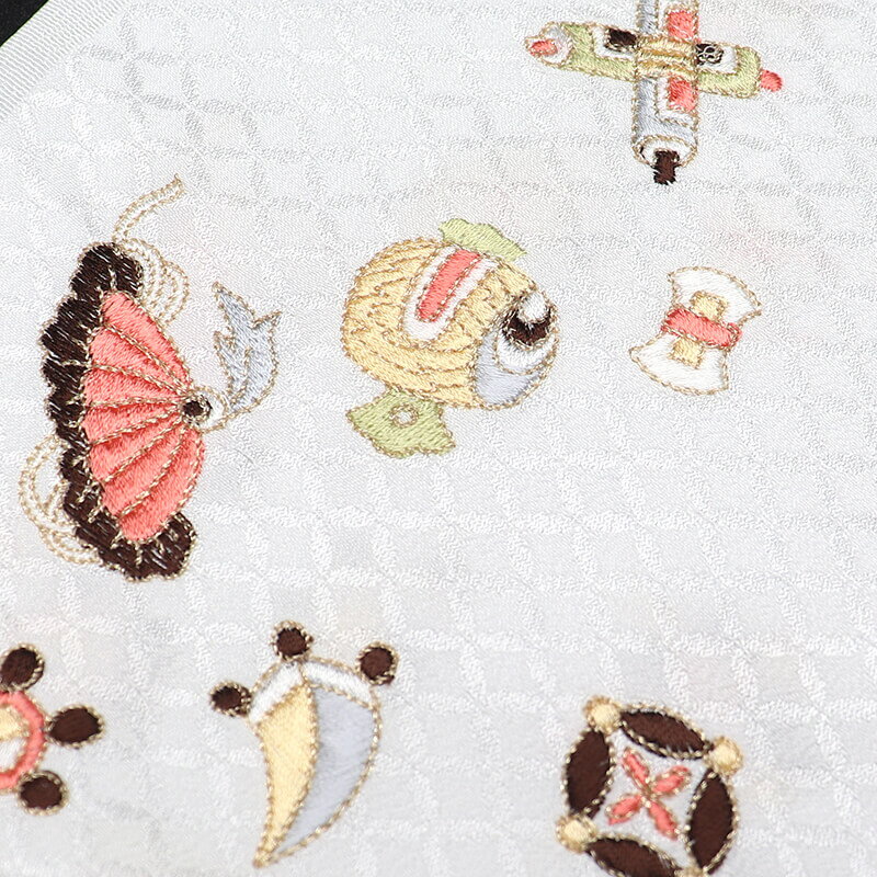 白地に、黄色や緑、オレンジなど、控えめな色合いで上品に表現された吉祥柄がおしゃれ。