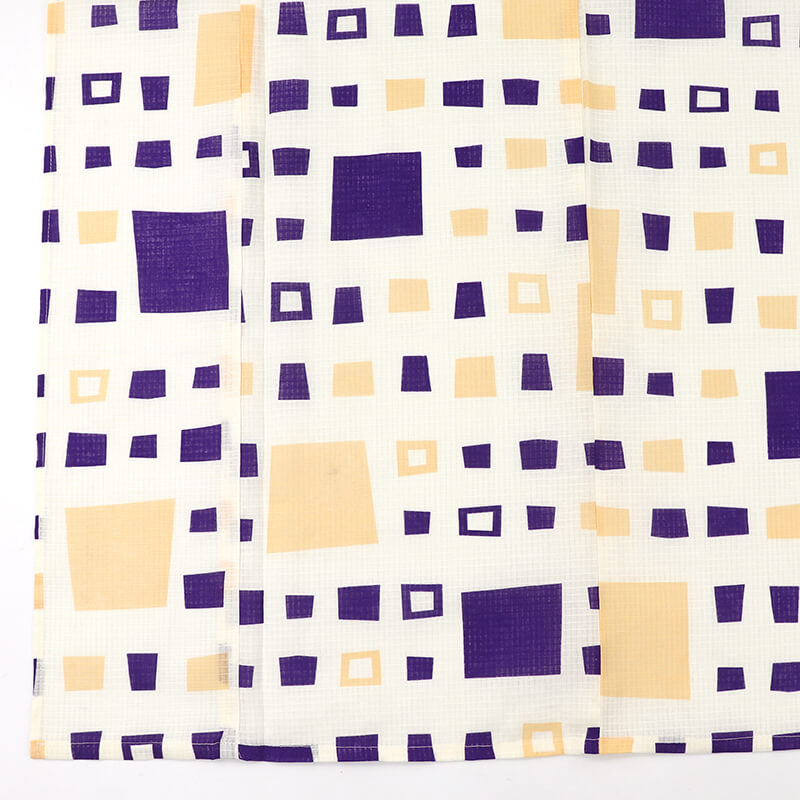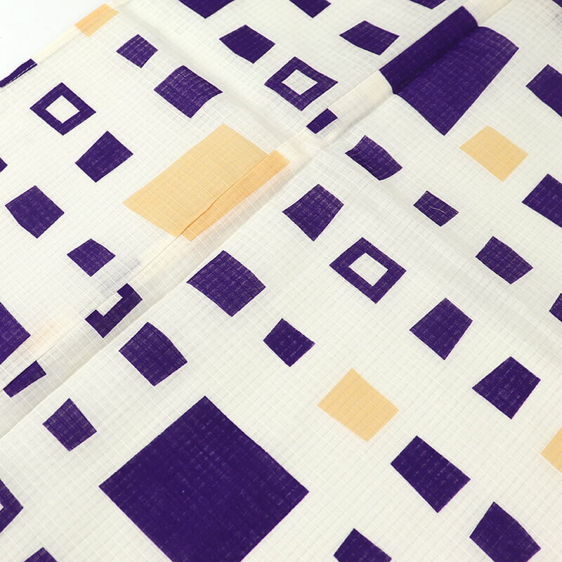 紫や山吹色の大きさの異なる四角柄が表現されており、夏着物感覚でも楽しめる雰囲気。