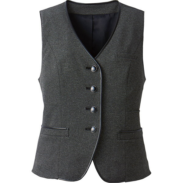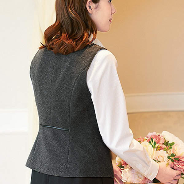 ★杢の表情が美しい上品なグレーニット素材に黒のトリミングが映えるエレガントなコレクション ★ポケットが充実した機能美ベスト ★高級感あふれるレザータッチのトリミング ★スマートフォンがすっきり収まるチェンジポケット付き ★コーティング加工されたボタンのエレガントな雰囲気 素材:ユーティライトバーズアイ・・・表情豊かな杢グレー。
