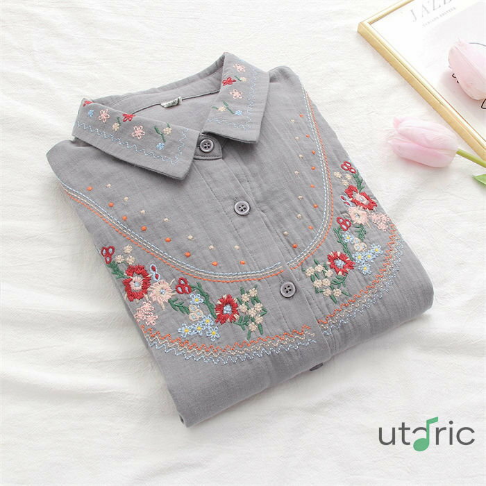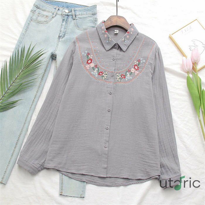 シャツ 刺繍 綿シャツ 刺繍シャツ レディース 長袖 ガーゼ 春 シャツ コットン 通勤シャツ ブラウス トップス シャツブラウス 無地 ボタン留め 花柄 お洒落 ガーゼシャツ 長そで カットソー グレー 長袖 体型カバー シンプル 重ね着 通勤 通学 学生 通気性
