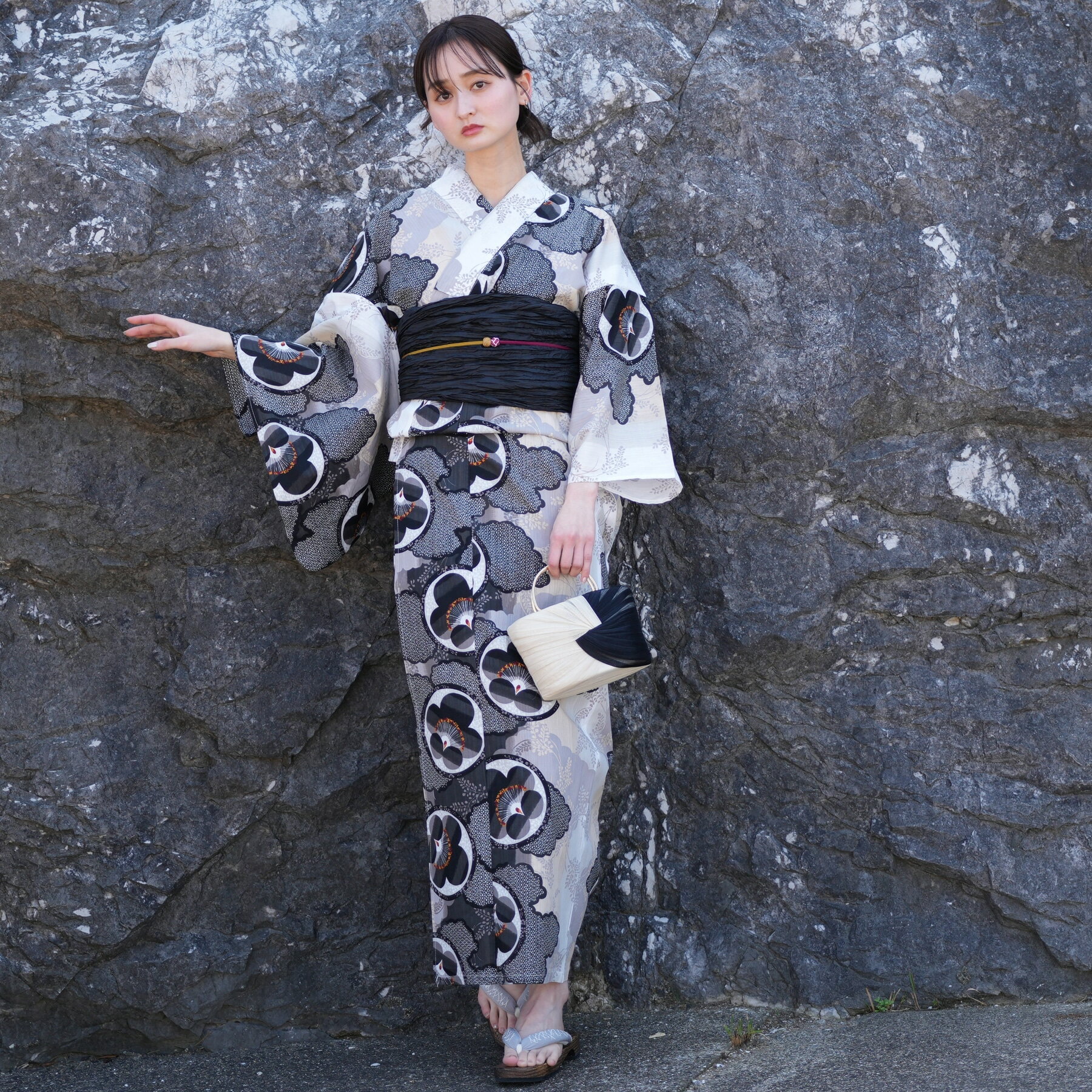 【実寸サイズ】 浴衣:身丈 約165cm・袖丈 約49cm・裄丈 約67cm 下駄:フリーサイズ(約22.5-24.5cm対応)
