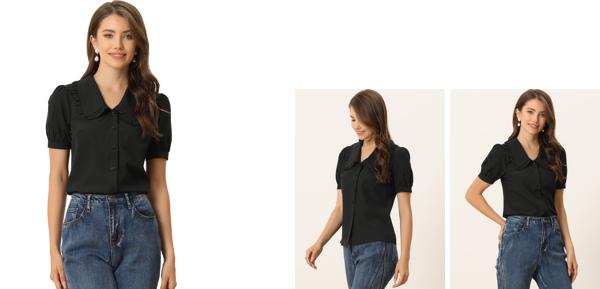 【属性1】フリルトリム付き丸襟、パフ半袖、ボタンカフス、ボタンダウン.