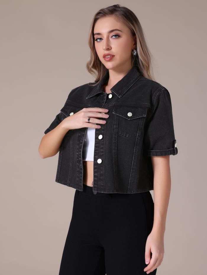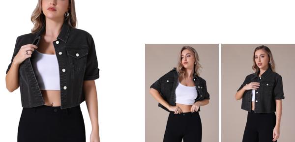 【属性1】時代を超えたファッションスタイル:クロップド丈が伝統的なデニムジャケットにモダンなひねりを加え、魅力的でトレンド感のあるシルエットを作り出します。