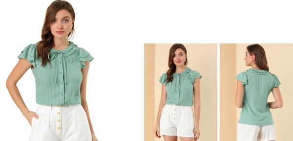 シンプルで繊細なこのブラウスは、フリルネック、ネクタイネック、短いフラッタースリーブ、ボタンフロント、このネクタイカフブラウスは、オフィスシックにまったく新しい意味を与えます。