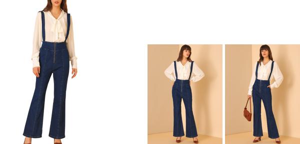 【属性2】ハイウエスト、取り外し可能なショルダーストラップ、ジップフロント、ベルバットムを備えたヴィンテージデニムのオーバーオールジャンプスーツは、あなたの新しい愛になります。