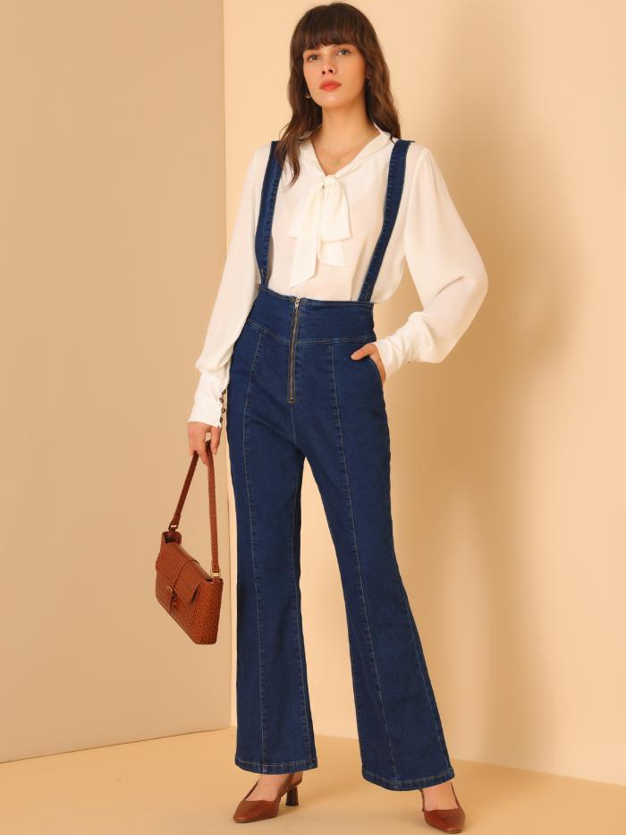 全体的にジップフロントデザイン、ストラップ、ロング丈、オフィスレディ向けのフレアボトムシルエットのヴィンテージジーンズ。