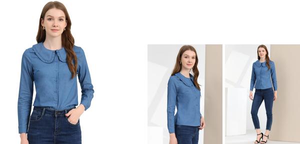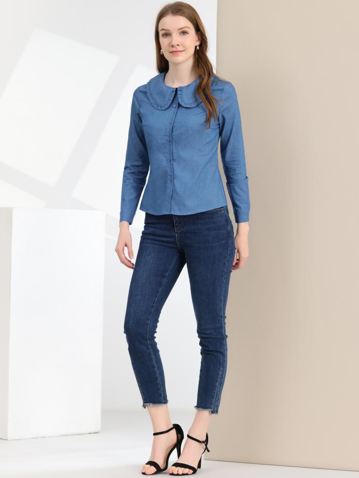 女性用デニムシャツには、襟付きのフリル付きピーターパンの襟のデザインが付いています。