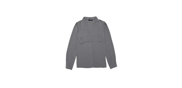 【属性1】長袖、ボタンアップ、滑らかなシフォン生地、肩のディテール、カットアウトVネックのスタンドカラー、