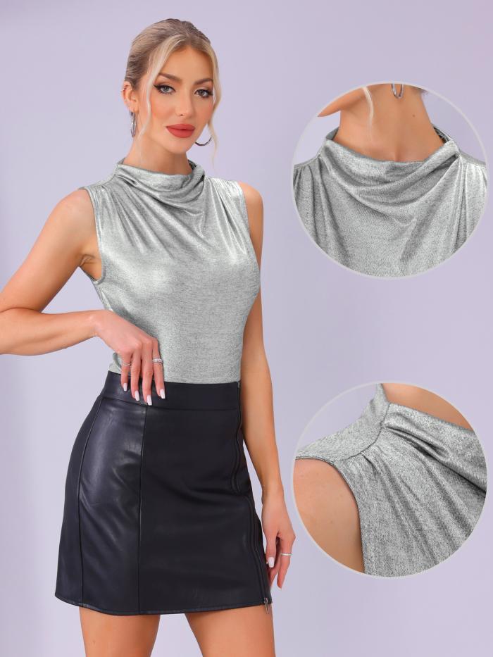 【属性3】このシルバーのトップスは、メタリック生地、カウルネック、ノースリーブ、ルーシュドレープ、無地など、いくつかのデザインポイントで構成されています。