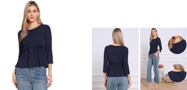 【属性3】このカジュアルトップスは、ペプラム裾、クルーネック、7分袖、ボタン装飾、伸縮性のある生地など、いくつかのデザインポイントで構成されています。