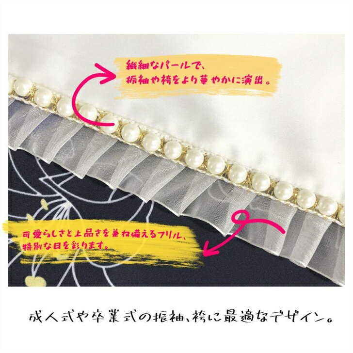 上品なパール装飾やレース、フリルが特徴で、和装スタイルに華やかなアクセントを加えます。