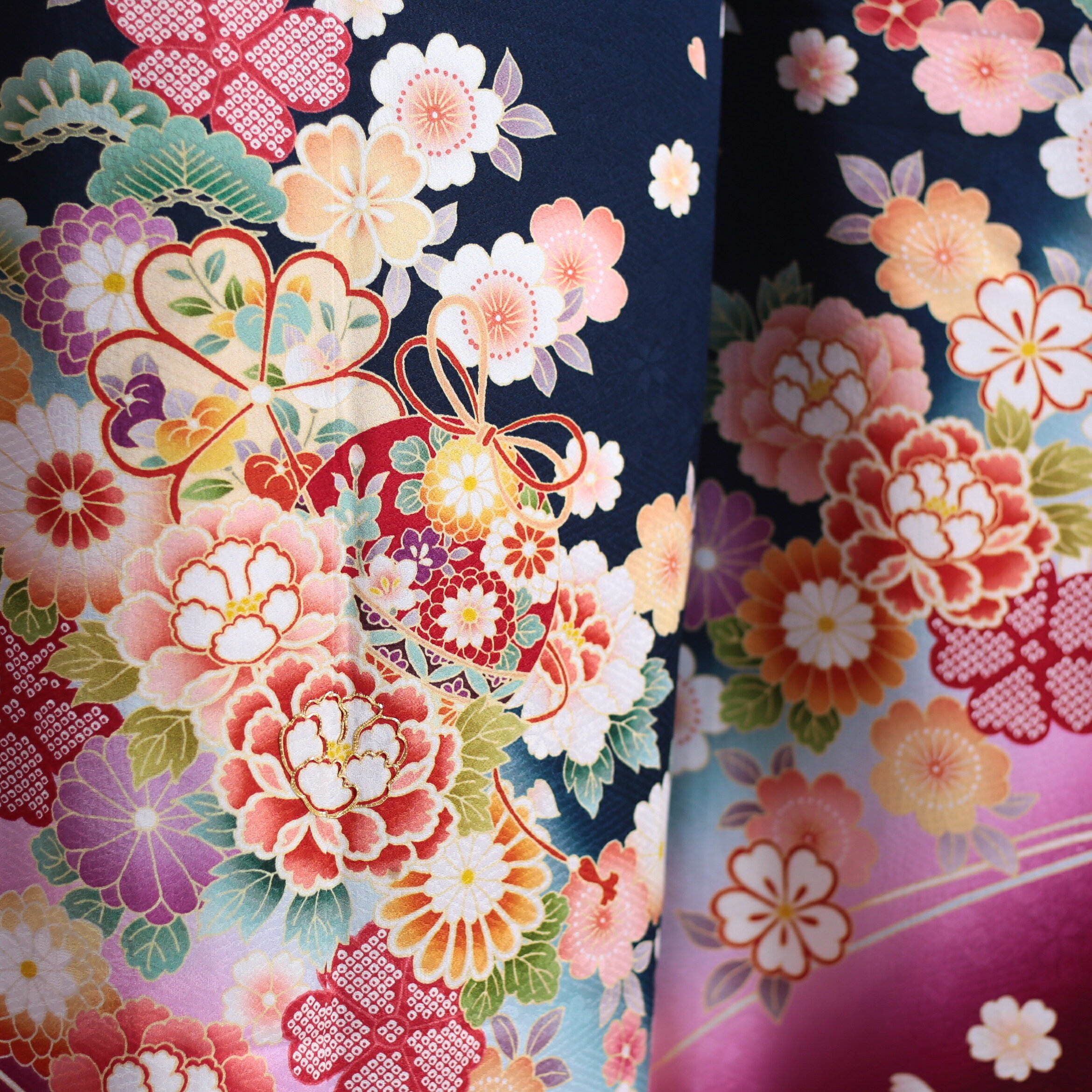 【中古】振袖 長襦袢 袋帯 半衿 重衿 帯締め 帯揚げ 7点フルセット ◆振袖 (正絹)深みある紺地に紫のぼかしがクールな古典振袖です。