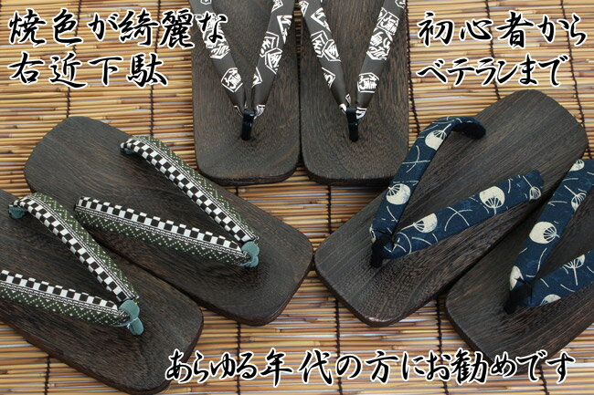 右近下駄とは底が滑らかなカーブになっている高さも抑えてある下駄のことで、 歯がなく比較的草履に近い形なので普段下駄を履きなれている方から これからチャレンジしようという方まであらゆる年代の人にお勧めです!! こちらは焼の加工、焼いて色を付けた上に蝋(ロウ)を塗る加工を施しており、 艶やかな色合いに仕上がっております。