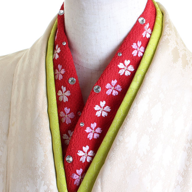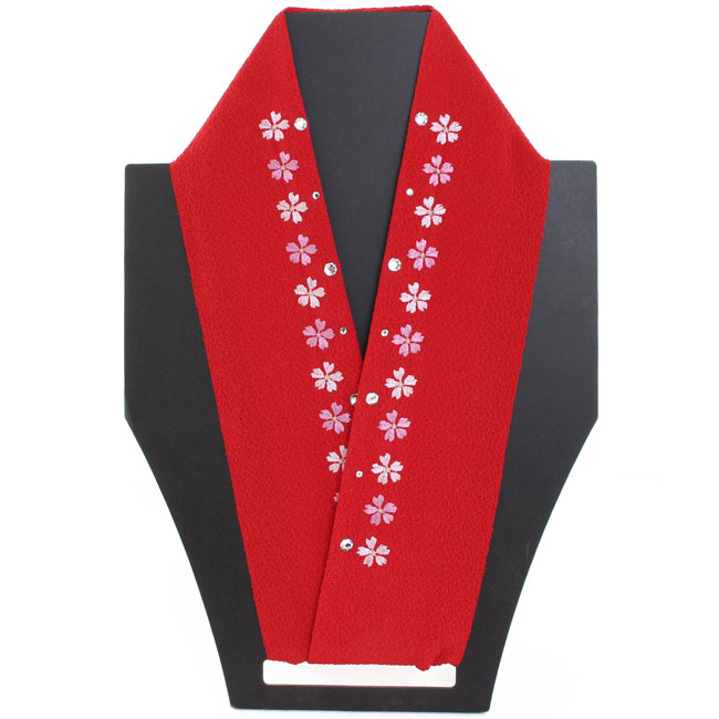 )刺繍半衿 ちりめん 洗濯OK 二色列小桜&ラインストーン〈赤〉 さくら レッド ピンク サクラ 振袖にぜひ合わせたい!お手入れ簡単なポリエステル素材の刺繍半襟のご紹介です。