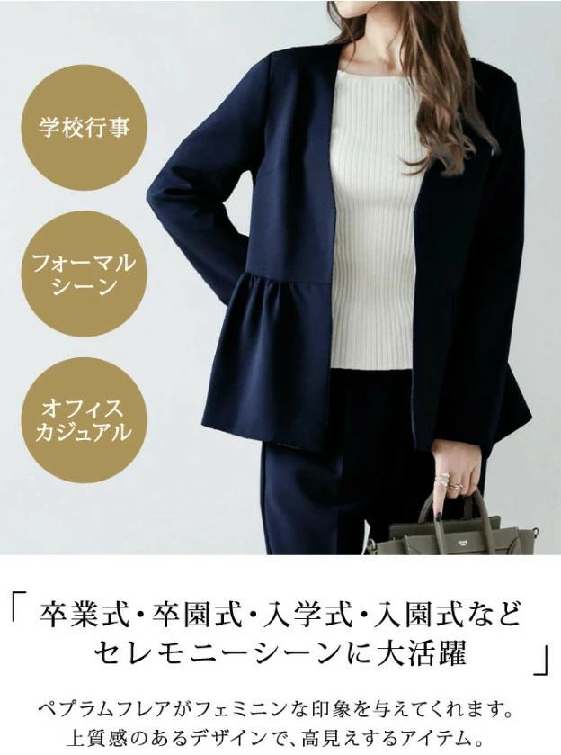 素材 素材:(表地)ポリエステル & ポリウレタン (裏地)ポリエステル 商品仕様 伸縮性:なし 裏地:あり 透け感:なし その他:ウエストゴム スタッフコメント ペプラムジャケット & テーパードパンツ セットアップ 卒業式・卒園式・入学式・入園式など セレモニーシーンに大活躍! ペプラムフレアがフェミニンな 印象を与えてくれます。