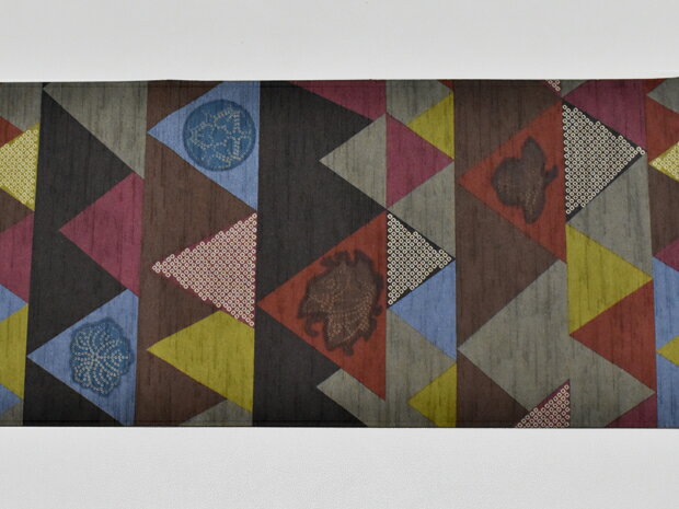 商品番号 kb-005 価格 47,000円(本体価格) 品質表示 素材 ポリエステル100%(帯芯は除く) 状態 新品 お仕立て済 六通長さ:約384センチ 幅:約31センチ 色柄 地色:濃い紫色やコゲ茶色など(様々。