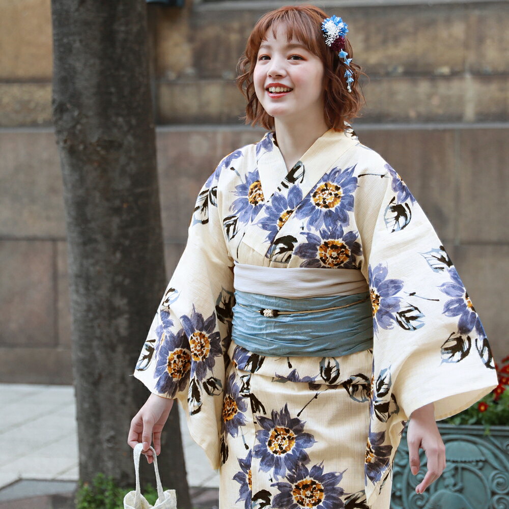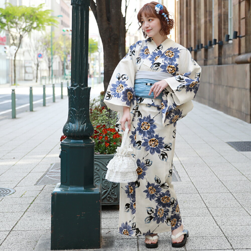新作浴衣3点セット花火大会・夏祭り・盆踊りなどの今年の夏の楽しいイベントをお気に入りの新しい浴衣で楽しみませんか? 生成り地に紺色のお花がレトロで華やかな 雰囲気に見えるとってもお洒落な雰囲気の浴衣です 。