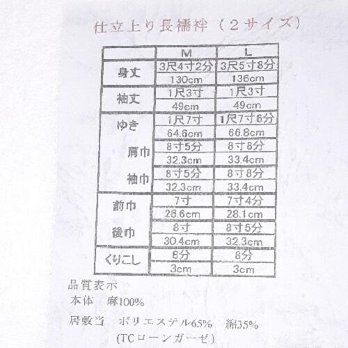 最高級本麻ジョーゼット手もみ楊柳素材、麻の長襦袢です ソフトな手触り肌触りと適度の量感が涼しさ爽やかさに加え、すっきりしたさばきを生みだしました また洗濯後の崩れ縮みがほとんどありません 夏の長襦袢として最適ですが、汗が多めの方など年間を通して長襦袢として、快適にお召しいただくことも可能です 吸湿性に富み衛生的で、ムレやベタツキを抑えさわやかな着心地、裾さばきの良い快適な長襦袢です きれいな着物ライン きれいな着物姿の第一歩は、正しい・着やすい肌着長襦袢選びからです 品質 麻100%、居敷当 ポリエステル65%綿35% カラー:白(麻キナリ ほぼ白ですが、本麻本来のほんの少し黄みがかった白です) *本体の衿をそのまま同素材の麻の掛け衿としてご使用いただけます もし半衿を別に付けられる方は、本体の衿の上から麻の半衿などをお掛けください 日本製 サイズはM・Lの2種類です(これはMです) M身丈130センチ 袖丈49センチ ゆき64.6センチ 肩巾袖巾32.3センチ 前巾26.6センチ 後巾30.4センチ くりこし3センチ L身丈136センチ 袖丈49センチ ゆき66.8センチ 肩巾袖巾33.4センチ 前巾28.1センチ 後巾32.3センチ くりこし3センチ0 L寸はこちらです! 本麻ジョーゼット手もみ楊柳長襦袢Lへ 本麻ジョーゼット手もみ楊柳着物スリップはこちらです 本麻ジョーゼット手もみ楊柳着物スリップMへ 本麻ジョーゼット手もみ楊柳着物スリップLへ最高級本麻ジョーゼット手もみ楊柳素材、麻の長襦袢です ソフトな手触り肌触りと適度の量感が涼しさ爽やかさに加え、すっきりしたさばきを生みだしました また洗濯後の崩れ縮みがほとんどありません 夏の長襦袢として最適ですが、汗が多めの方など年間を通して長襦袢として、快適にお召しいただくことも可能です 吸湿性に富み衛生的で、ムレやベタツキを抑えさわやかな着心地、裾さばきの良い快適な長襦袢です きれいな着物ライン きれいな着物姿の第一歩は、正しい・着やすい肌着長襦袢選びからです 品質 麻100%、居敷当 ポリエステル65%綿35% カラー:白(麻キナリ ほぼ白ですが、本麻本来のほんの少し黄みがかった白です) *本体の衿をそのまま同素材の麻の掛け衿としてご使用いただけます もし半衿を別に付けられる方は、本体の衿の上から麻の半衿などをお掛けください 日本製 サイズはM・Lの2種類です(これはMです) M身丈130センチ 袖丈49センチ ゆき64.6センチ 肩巾袖巾32.3センチ 前巾26.6センチ 後巾30.4センチ くりこし3センチ L身丈136センチ 袖丈49センチ ゆき66.8センチ 肩巾袖巾33.4センチ 前巾28.1センチ 後巾32.3センチ くりこし3センチ0 L寸はこちらです! 本麻ジョーゼット手もみ楊柳長襦袢Lへ 本麻ジョーゼット手もみ楊柳着物スリップはこちらです 本麻ジョーゼット手もみ楊柳着物スリップMへ 本麻ジョーゼット手もみ楊柳着物スリップLへ