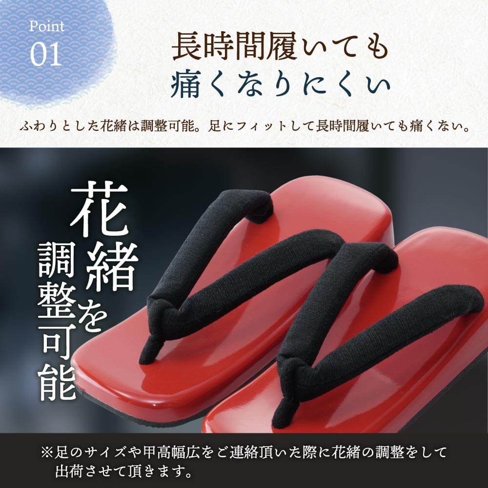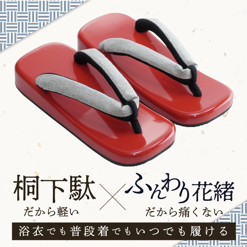 特徴3.美しい艶のある朱塗り仕上げ 桐男草履下駄は、材料に非常に軽量で柔らかい「桐」を使用し、下駄の表面を職人が1足1足丁寧に手仕上げし塗りあげた美しい仕上がりとなっています。
