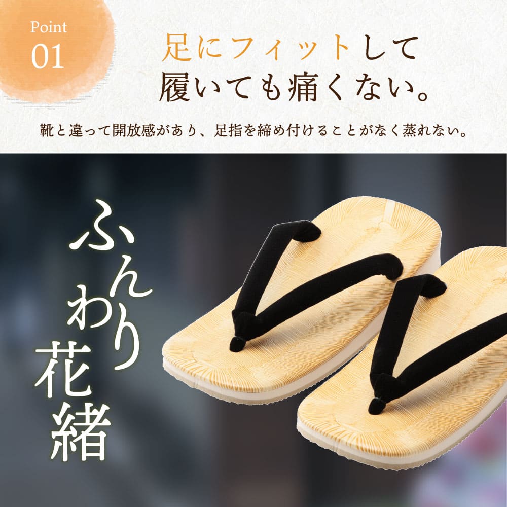 特徴3.長時間履いても疲れにくい 伝統的な花緒の作り方を熟知した日本の職人が1足1足丁寧に仕立てているため、花緒に張りがありながらもクッション性がある仕上がりになっています。