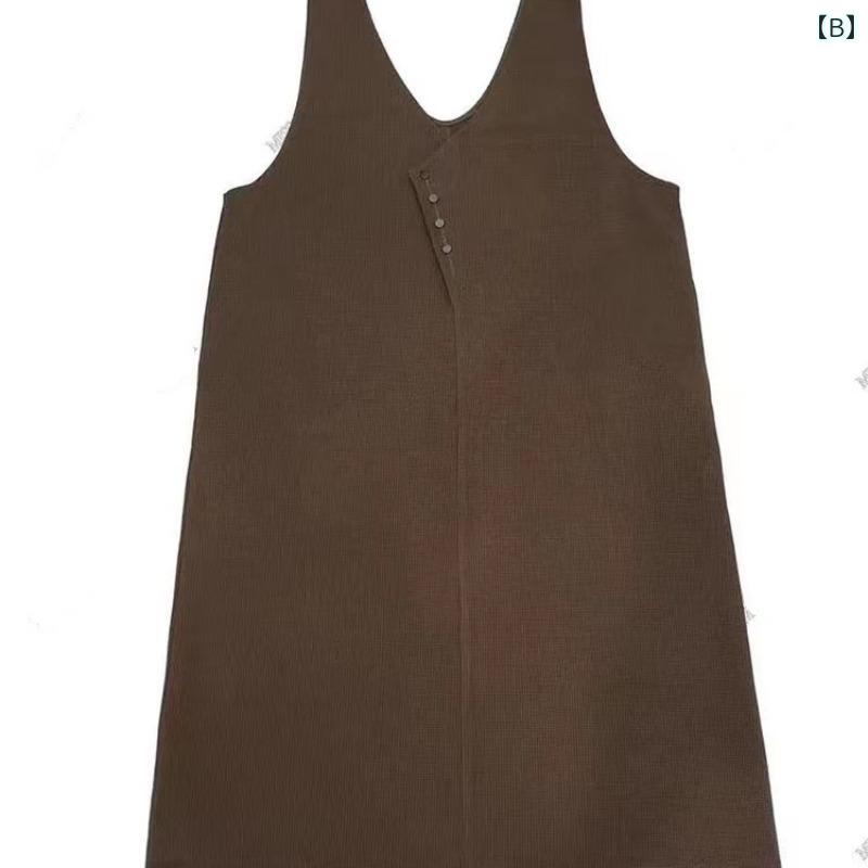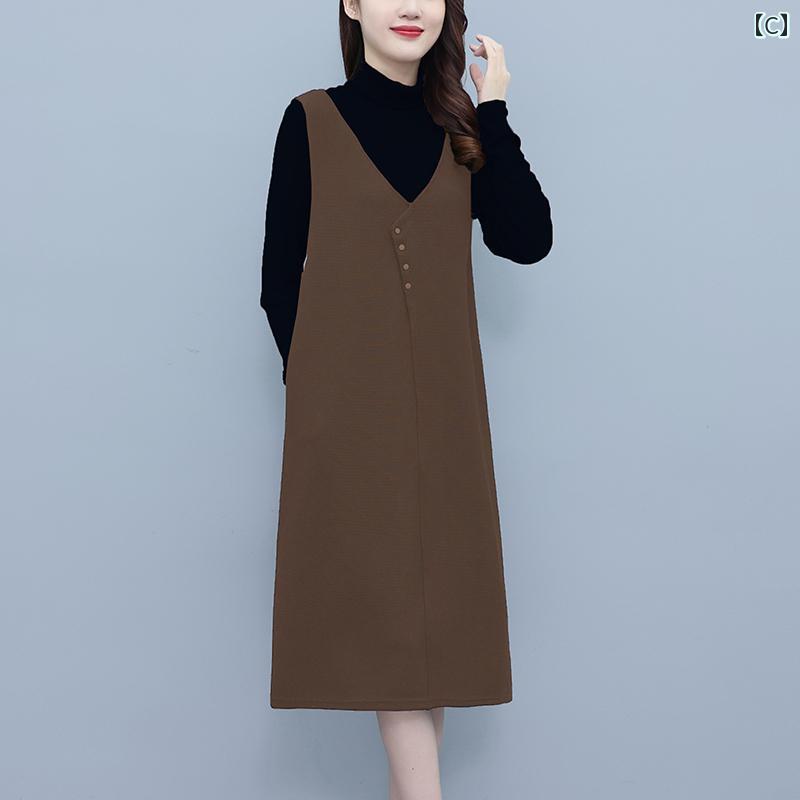 オーバーオール スカート レディース Vネックノースリーブ 春秋 ミディ丈 ルーズ ボトム 大きいサイズ Aライン 無地 シンプル インナー ツーピース 黒 茶